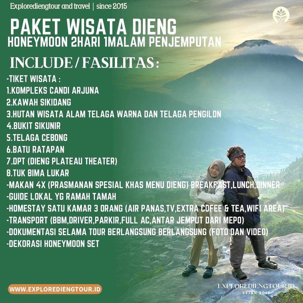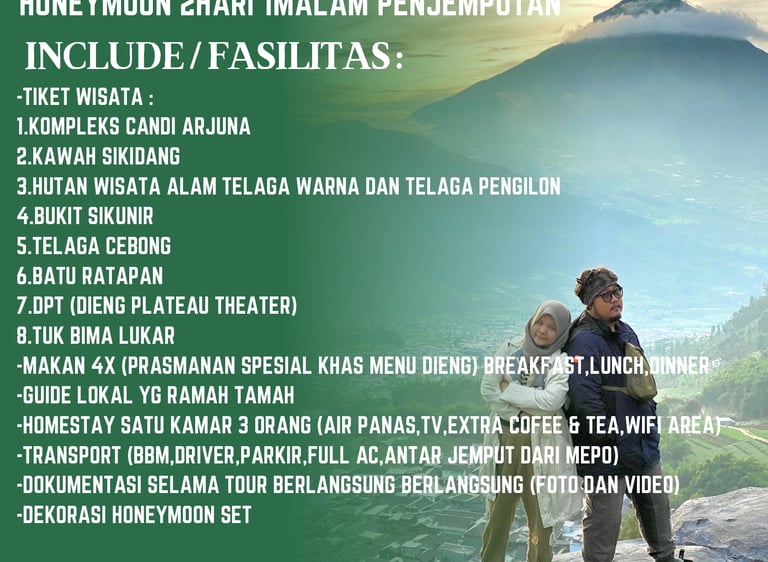 Paket wisata Dieng Honey Moon, Akan sangat berkesan untuk pasangan yang barus saja menikah, dan ingin berbulan madu di Dataran Tinggi Dieng, Tentunya kami memiliki Destinasi Wisata Khusus untuk paket Honey Moon