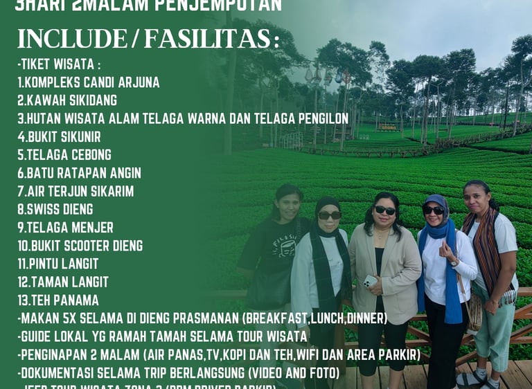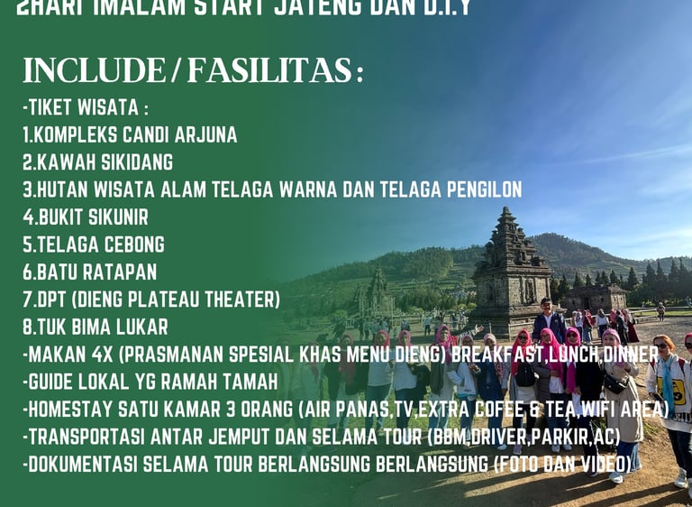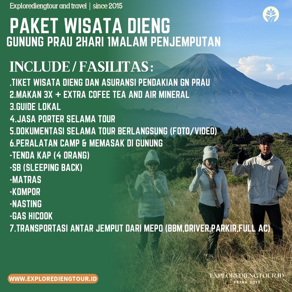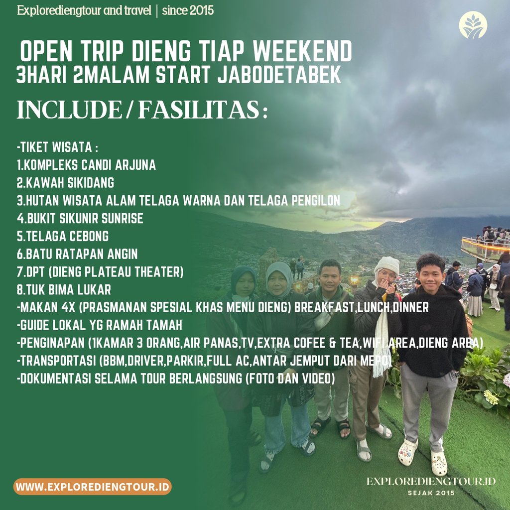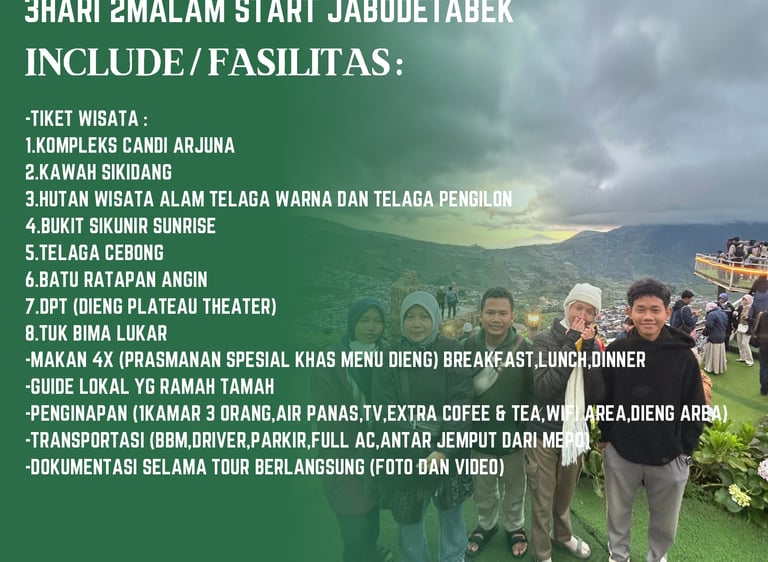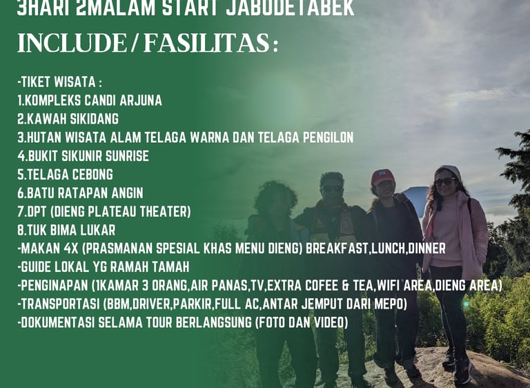 Paket wisata Dieng 2hari 1malam sangat cocok untuk keluarga atau orang terdekat yang ingin anda ajak ke Dieng, dalam paket wisata Dieng 2hari 1malam, anda akan kami ajak untuk menikmati keindahan alam Dieng, dan ber isi destinasi wisata Dieng unggulan