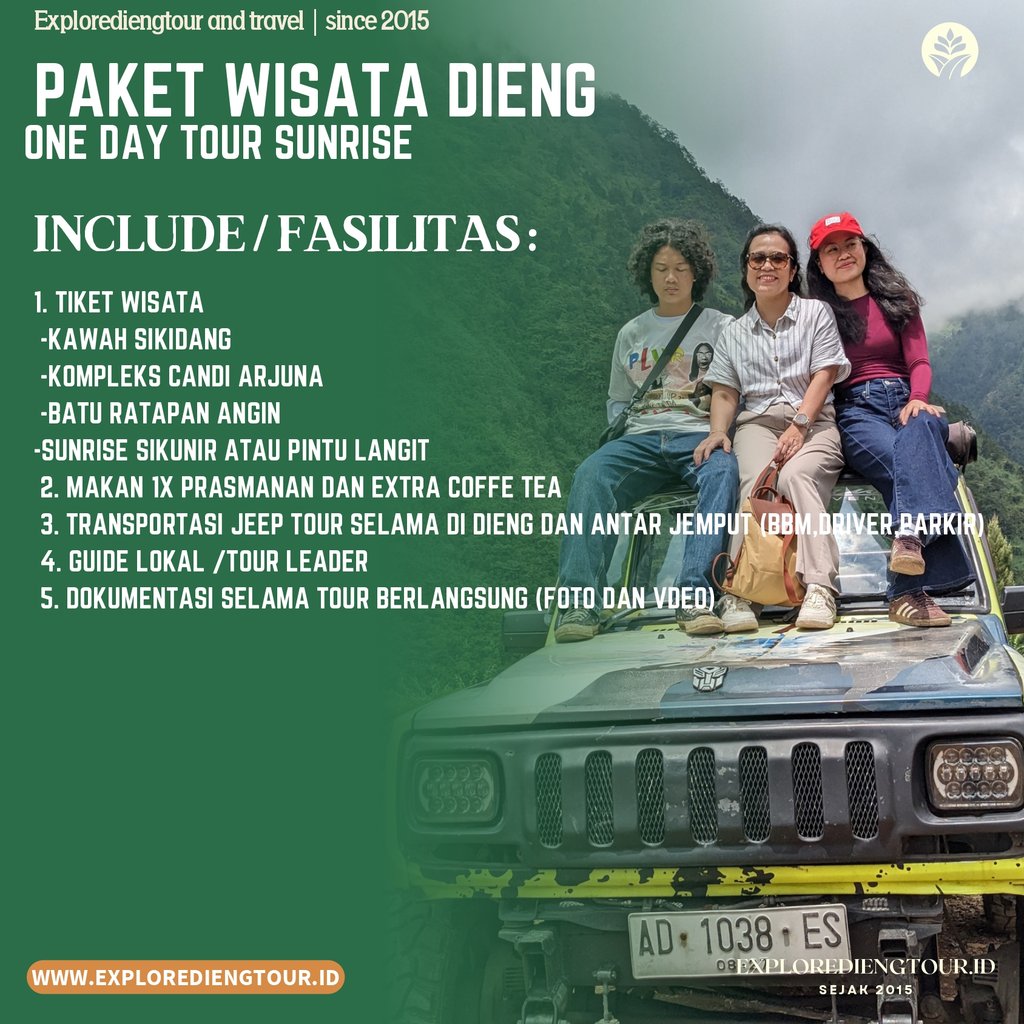Paket wisata Dieng satu hari, merupakan paket wisata Dieng, yang sangat cocok, bagi anda yang punya waktu sebentar, namun sudah bisa melihat keindahan view ala eropa di Dieng, paket wisata ini hanya berdurasi singkat, namun anda akan kami ajak mengunjungi berbagai destinasi wisata unggulan tentu nya, yang mudah di jangkau, dan tidak memakan banyak waktu.